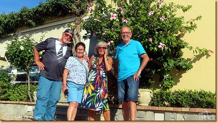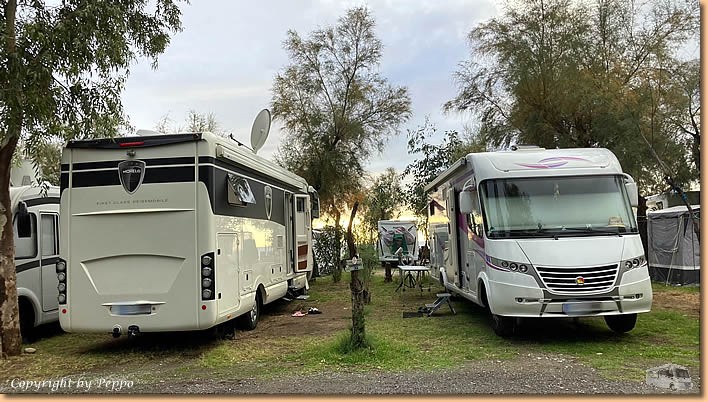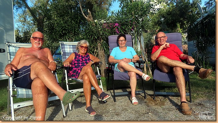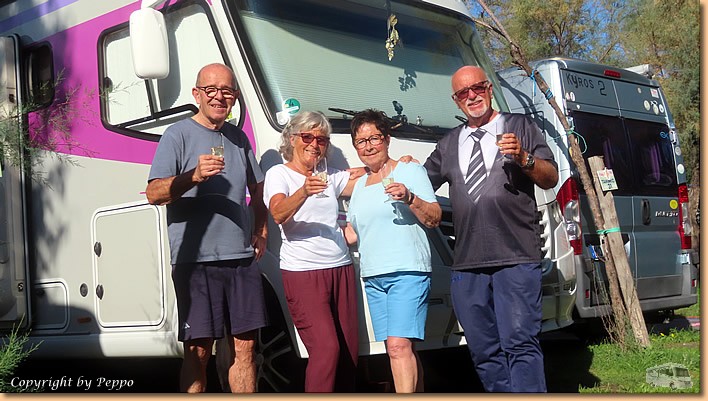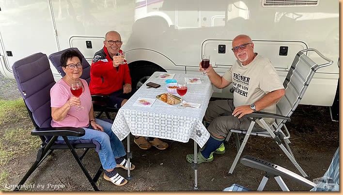 | Um 11 Uhr treffen unsere Freunde Bärbel und Klaus ein. Zwei freie nebeneinanderliegende Parzellen sind gleich gefunden, wir ziehen um und freuen uns nun über ein paar gemeinsame Tage. Ein paar Regentropfen machen unserer Wiedersehensfeier überhaupt nichts aus. Markise raus, Aperol und vino auf den Tisch und unser Camperleben ist perfekt. |