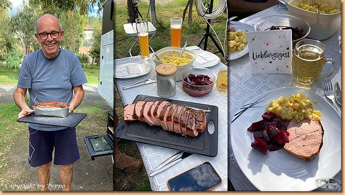 | Bärbel und Klaus laden uns heute zum schon fast traditionellen Leberkäsessen ein. Vielen Dank, es schmeckt wie immer ausgezeichnet. Erst die untergehende Sonne beendet unser gemütliches Zusammensitzen, ab ins Womo, ciao bis morgen. |