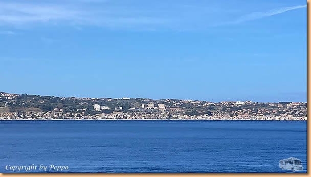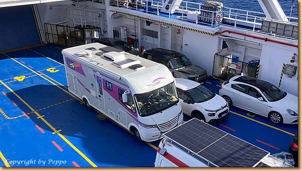 | In Villa San Giovanni läuft es auch perfekt. Ohne Wartezeit auf die Fähre und es geht sofort los. Mit 60,70 € sind wir dabei und nach knapp 25 Minuten rollen wir auch schon wieder hinunter. Auch das obligate Chaos in Messina bleibt aus, rauf auf die Autobahn nach Palermo und nach kurzer Fahrzeit treffen wir an unserem heutigen Ziel ein. |