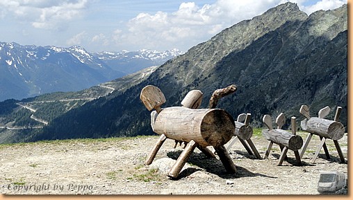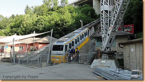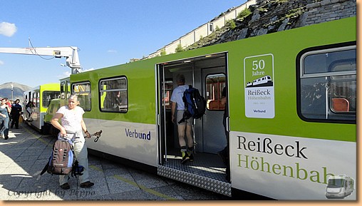 Da wir heuer eine womoarme Zeit haben und dank Mutter- und Vatertag auch zu den Kärnten-Card-Besitzern gehören ist unser erstes Ausflugsziel das Reisseck. Mit unserer ist die Fahrt gratis, lediglich Müsli muss ihr Taschengeld um 5,50€ erleichtern. In drei Teilstrecken überwinden wir mit der Reisseckstandseilbahn einen Höhenunterschied von 1518 Metern, das steilste Teilstück hat 82% Steigung. Am Schoberboden auf 2237 m Seehöhe gehts mit der Reisseckhöhenbahn weiter zum Seenplateau. Diese Schmalspurbahn fährt mit ca. 30km/h mehr oder weniger laut durch einen Tunnel und an senkrechten Felswänden vorbei zum Bergrestaurant und ist Europas höchste Eisenbahn. (Video)