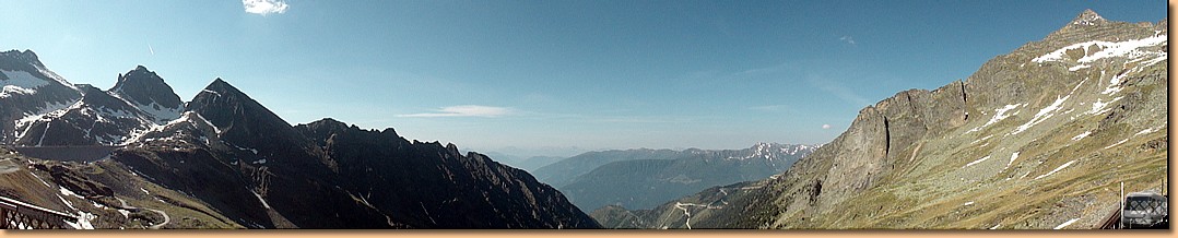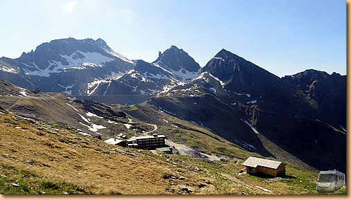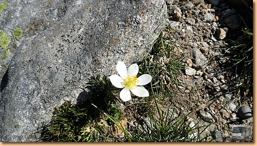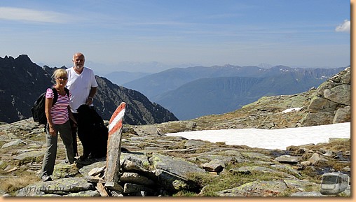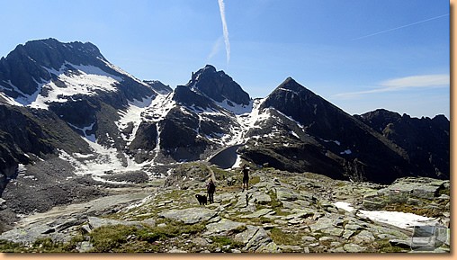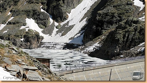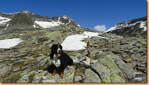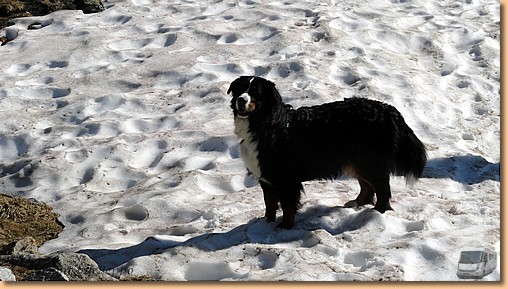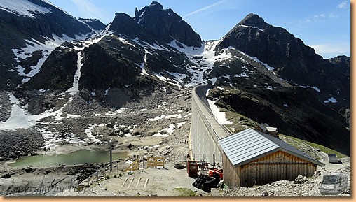 Im Tal hat es heute ca. 35°C, wir marschieren bei angenehmen Temperaturen und zur Freude von Müsli über noch vorhandene Schneeflecken auf dem Rundweg zur Staumauer. |