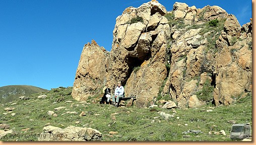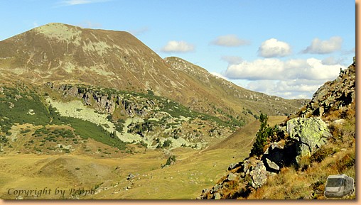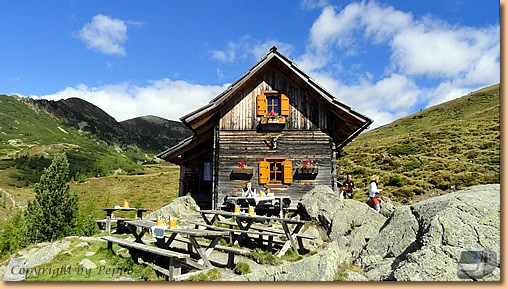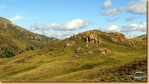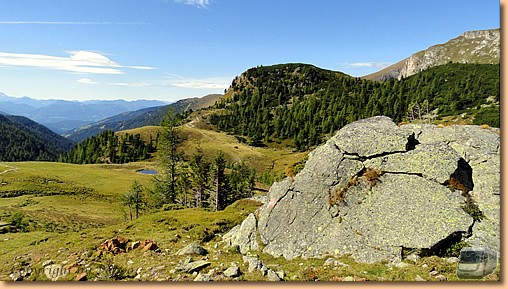 Wir entschließen uns für den ca. 7 km langen Rundweg Richtung Mallnock (2215m). Wir machen einen Zwischenstopp bei der "Roten Burg", einem Dolomitstein mit Eisenanteil, der bei Sonnenbestrahlung weithin rot leuchtet. |