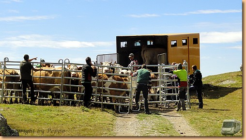 Murmeltiere pfeifen uns wieder den Marsch und Senner treiben ihre Kühe mit lauten Rufen zusammen. Almabtrieb ist heute, die Tiere werden ins Tal gebracht, manche freuen sich wohl auf den Stall, einige jedoch ziehen die Freiheit noch vor und es gibt Laufduelle mit den Hirten. |