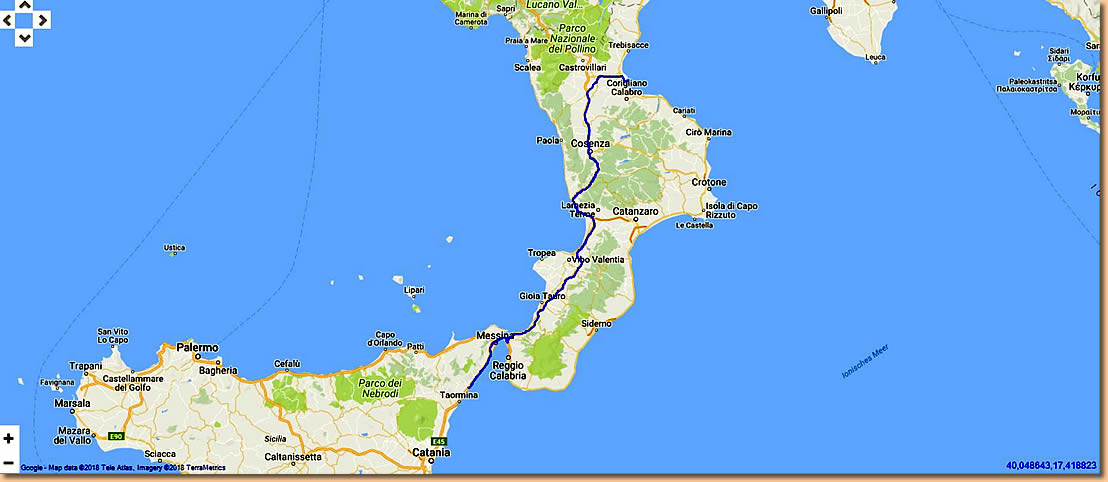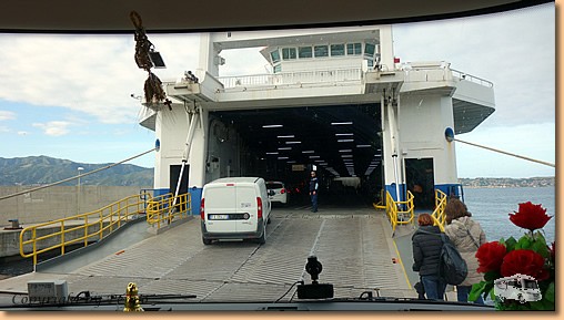 Und wieder gehts ein Stück weiter. Wir verabschieden uns von Freunden am CP und hoffen auf ein Wiedersehen im Herbst 2016 auf La Masseria bei Gallipoli. Onda Azzurra ist für uns nur mehr als 2-5 Tage Aufenthalt angedacht, irgendwie hat der Platz ziemlich abgebaut, man fühlt sich nicht mehr sonderlich wohl. Die Fahrt nach Villa san Giovanni verläuft ohne Probleme, die Fähre wartet bereits und bringt uns in kurzer Zeit um 56 € nach Messina auf Sizilien.