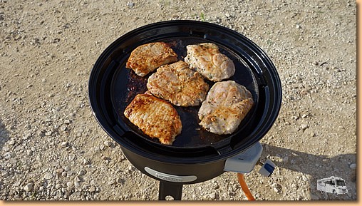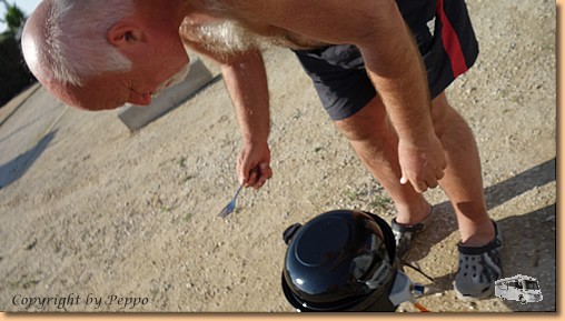 Der Wind ist heute nachmittag etwas frisch und unser Küchenzelt tut zum ersten Mal gute Dienste. Bequem haben Küchenzeile, Tisch und Sesseln Platz und bei angenehmer Temperatur sitzen wir gegen Abend noch eine Zeit (fast) im Freien. |