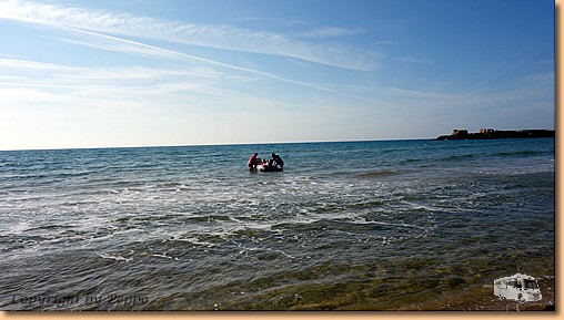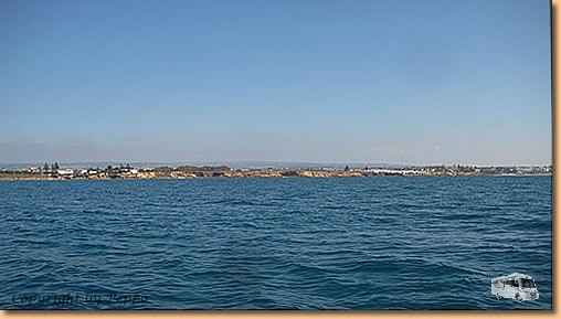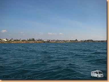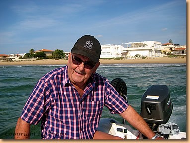 Wir beschließen doch auf unserem Sonnenplatz zu bleiben und hoffen auf nicht allzu heftige Winterstürme. Am Vormittag werde ich von Rudi zu einer Bootsfahrt eingeladen. Lang dauert sie nicht, starke Wellen gewinnen die Oberhand und wir kommen recht nass wieder an Land. Dafür gibts dann einen ausgiebigen Manöverschluck. |
