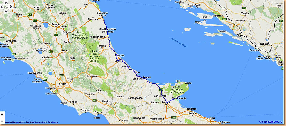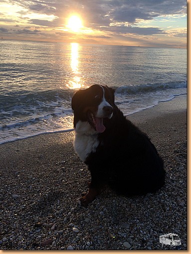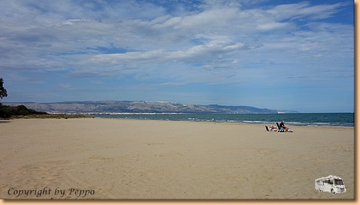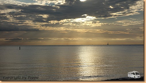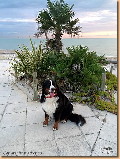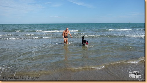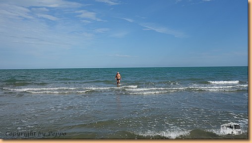 Nach dem Frühstück gehts wieder weiter auf der Autobahn, die wir erst nach rund 300 km bei Foggia wieder verlassen. Am CP Lido Salpi ist unsere heutige Etappe zu Ende. Die Sonne, Strand und Meer laden sofort zum Baden ein. Müsli und ich machen auch Gebrauch davon, Helga hält sich vornehm zurück - einer muss schließlich auch fotografieren!!! |