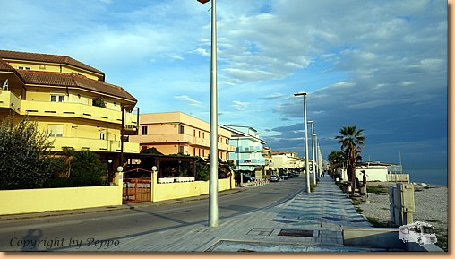 Nachts kommen ehemalige Heimatgefühle auf denn man hört recht oft Signale vorbeiratternder Züge. Sonst alles okay. Morgenspaziergang am Lungomare, vorbei an Fischhütten mit frischer Ware. |