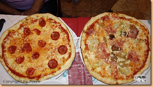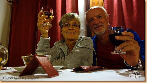 Ein paar Regentropfen scheuchen uns ins Womo und, da die Pizzeria am Platz erst um 19 Uhr öffnet, ist Hüttenschicht angesagt. Wir heben die Gläser auf unseren Florian, der heute vor einem Jahr als Baummeister beim Magistrat Villach seinen Dienst angetreten hat. |