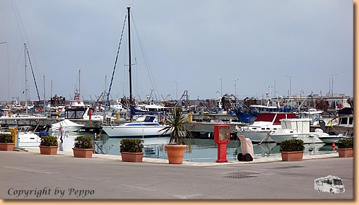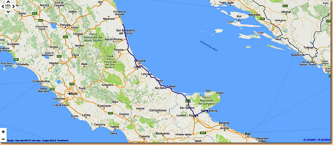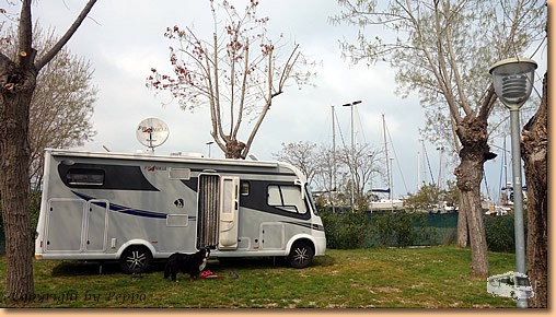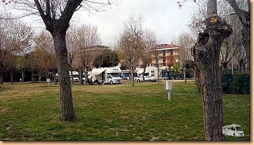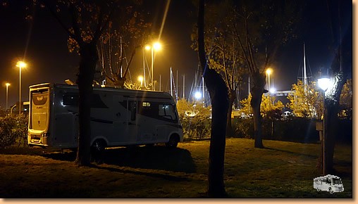 Eigentlich wollen wir zwei Tage bleiben. Aber ein Blick auf den Wetterbericht lässt uns das Womo startklar machen. Ein Wettersturz mit Regen und ziemlichen Sturmböen ist vohergesagt, also nicht unbedingt das Gelbe vom Ei, und außerdem ist ja heute das 2. Halbfinalmatch KAC - Vienna Capitals. Wind können wir dabei gar nicht gebrauchen. Gut 300 km auf LKW-freier Autobahn macht das Reisen angenehm und in Porto San Giorgio erwartet uns ein ansprechender Stellplatz. |