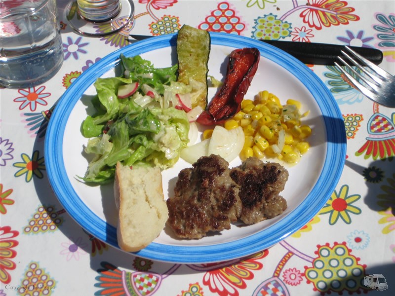 Wetter wie immer. Tagesprogramm Urlaub. Nach gemeinsamen Frühstück mit den Schweizern lesen und sonnen. Zu Mittag wird gegrillt, die selbstgemachten Plescavica mit Salat (. . . und vino und Schnaps) schmecken gut.