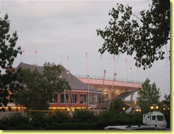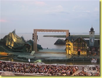 Um 7:00 Abfahrt zum Neusiedlersee, Camping Oggau. Da lt. Wetterbericht das Thermometer auf 30°C klettern wird, fahren wir den CP an. Wir brauchen Strom für unsere Klimaanlage. Um 12 Uhr treffen wir ein, finden einen geeigneten Platz und machen es uns gemütlich. Es ist drückend heiß und die ersten schwarzen Wolken ziehen auf. Um 15:00 entlädt sich ein heftiges Gewitter, es regnet in Strömen und wir befürchten, dass die heutige Vorstellung buchstäblich ins Wasser fallen wird. Lisl und Herbert besuchen uns, sie wollen uns nach Mörbisch mitnehmen. Wir flüchten ins Cafe, ein ausgezeichneter Apfelstrudel samt Kaffee und Wein entschädigt uns ein wenig für das schlechte Wetter. Um 19:00 Uhr klart es auf und wir machen uns auf nach Mörbisch. R.+E. sind auch am Parkplatz eingetroffen und erwarten uns schon.