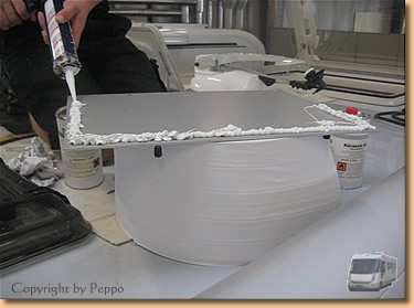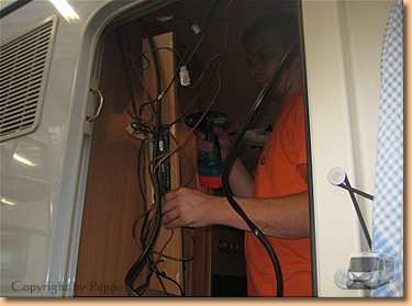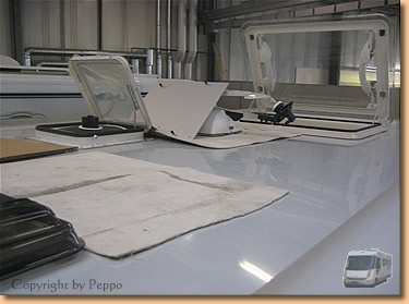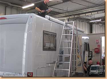 Der Morgenspaziergang führt uns beim Bäcker vorbei und somit stehen am Frühstückstisch frisches Gebäck und Kuchen. Weiter gehts zu unserem eigentlichen Reiseziel, der Fa. Niesmann + Bischoff in Polch. Wie auch die bis jetzt angefahrenen Stellplätze ist auch dieser fast voll, wir finden jedoch ein ideales Plätzchen gleich neben einer Wiese. Ein Mitarbeiter von N+B ist auch bald zur Stelle, ich gehe mit ihm die Checkliste durch und zu unserem Erstaunen haben wir um 12:30 schon den ersten Termin, obwohl erst für morgen vereinbart. Helga packt Fefi, Buch und Handarbeit und sucht Platz in der klimatisierten Lounge des Hauses. Ich fahre unser Womo in die Werkstatt und muß diese auch alsbald verlassen, einige Bilder der ersten Arbeiten kann ich jedoch noch machen.