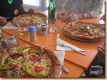 Vormittag ab ins Bad, zum Mittagessen gehen wir zusammen mit Elke und Klaus in die Pizzeria im Ort. 2 gute Pizzen, 4 grosse Bier macht zusammen € 13.-.