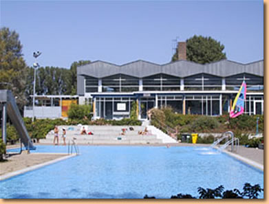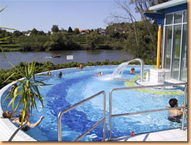 Am Abend steht ein Besuch des am Stellplatz angrenzenden Hallenfreibades am Programm, wo wir den direkten Blick vom Warmwasserfreibecken, keine 10 Meter oberhalb des Mains, auf den Fluss haben und mit den riesigen Frachtschiffen parallel mitschwimmen können.