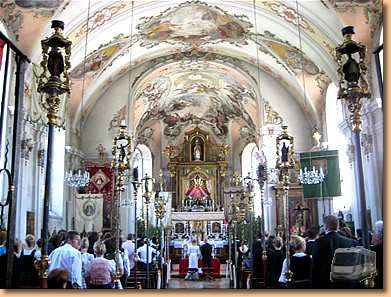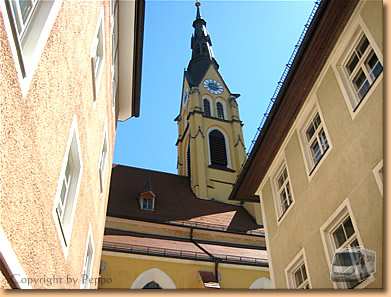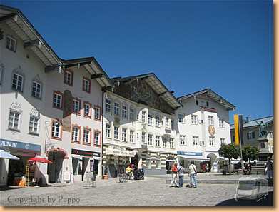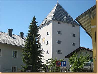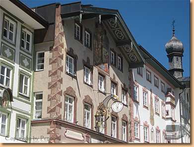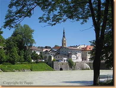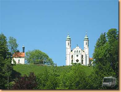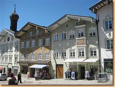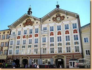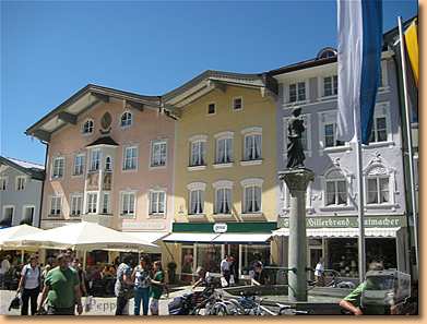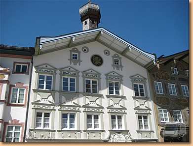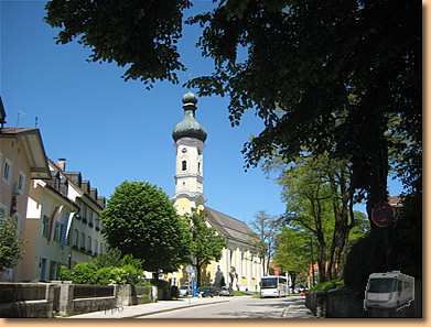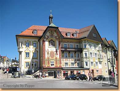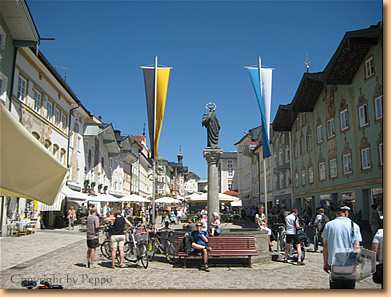 Wir schauen morgens aus dem Fenster und stehen vor einem riesigen Flohmarkt. Fleißige Hände haben ganz leise viele Stände aufgebaut. Nach dem Frühstück ist ein Rundgang Pflicht, für uns ist aber leider nichts dabei. Wir erreichen Bad Tölz gegen Mittag und der Stellplatz an der Isar ist gerammelt voll. Aber wie immer haben wir Glück, ein Camper aus A fährt ab und wir bekommen seinen Platz. Zum zweiten Mal Glück, denn vor 2 Tagen ist der Platz wegen Hochwasser gesperrt gewesen, die Spuren sieht man noch deutlich. Es ist heiß, Strom gibts leider nicht, so gehe ich alleine in die Stadt, Helga bleibt bei den Hunden vorm Womo. Bad Tölz besteht im wesentlichen aus der Markt- und der Salzstrasse und wird rechts und links von Häusern mit der bekannten "Lüftlmalerei" gesäumt. Auch das historische Wahrzeichen der Stadt, die Mühlfeldkirche, der Khanturm, das Winzererdenkmal und das Marienstift stehen hier.