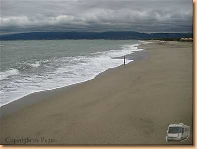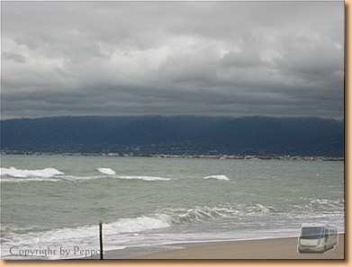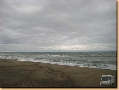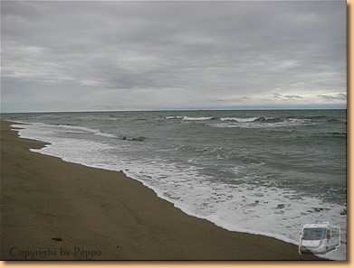 Keine Wetterbesserung in Sicht. Es regnet zwar den ganzen Tag nicht, aber von Sonne keine Spur. Wir beschließen einen Tag früher unsere Heimreise anzutreten. Mittags gönnen wir uns noch einmal Gamberi vom Grill und packen dann langsam unsere Sachen ins Womo. Wir machen einen letzten Strandspaziergang denn zum Baden lädt das aufgewühlte Meer sowieso nicht mehr sonderlich ein.