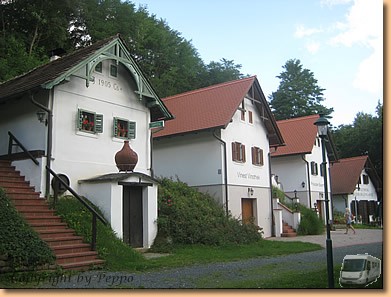 Zum Frühsport gehts mit Müsli auf den 7 km - Zeinerberg - Rundweg. Die ersten 1,5km ideal durch Wald, dann den Rest etwas enttäuschend auf Asphaltwegen durch Felder. Die sporadischen Wegmarkierungen machen es Ortsunkundigen schwer auf der richtigen Strecke zu bleiben. Aber wir schaffen es und nach dem Frühstück fahren wir nach Moschendorf ins Weinmuseum. Leider ist das Museum noch geschlossen, deshalb können wir die naturgetreuen Häuser nur von außen besichtigen.