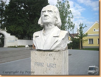 In Raiding machen wir einen Zwischenstopp und schauen uns das Geburtshaus von Franz Liszt an. Vor dem Gemeindeamt ertönt zu jeder vollen Stunde, gleichzeitig mit kleinen Wasserfontänen, eine Melodie des Komponisten.