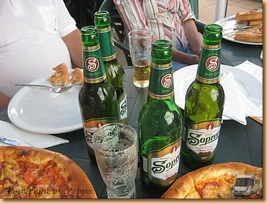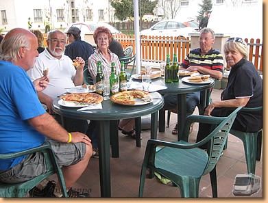 Der Regen in der Nacht ist mäßig, die Sonne scheint und es ist angenehm warm. Also beschließen wir der Pizzeria in der Stadt einen Besuch abzustatten. Keine schlechte Idee, Pizzen und Eis schmecken gut und da es kleine Wagenräder sind reicht es auch noch zum Abendessen.