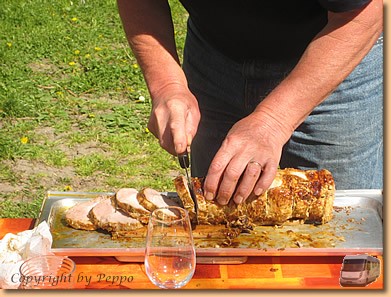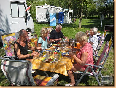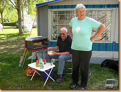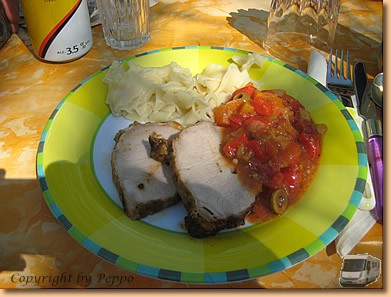 Der Tag gleicht ganz dem vorherigen. Nur diesmal sind wir bei Toni und Yvonne zum Essen eingeladen. Toni's Braten auf dem Grill schmeckt vorzüglich, Yvonne's Zutaten Gemüse, Nudeln und griechischer Salat stehen um nichts nach. Gegrillte Bananen mit viel Schnaps, Kaffee und Torte bilden den Abschluß.