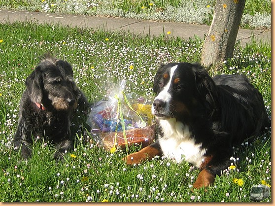 Wie gut, dass wir 2 Suchhunde als Begleiter haben. Der Osterhase wird frühmorgens aufgespürt und das Nest (natürlich von den Kindern) bewacht und gegen Schokoräuber verteidigt. Wir wünschen somit Eva, Florian und Claudia sowie allen Freunden und Lesern