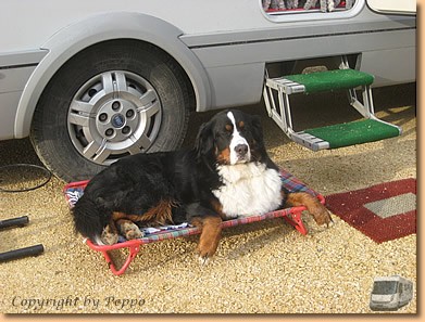 Am Nachmittag treffen Anna und Peter ein, mit ihnen auch die Sonne und Müsli kann ihrer Lieblingsbeschäftigung beim Campen nachkommen: Vorm Womo liegen und die Lage unter Kontrolle halten.