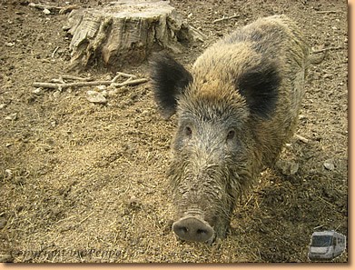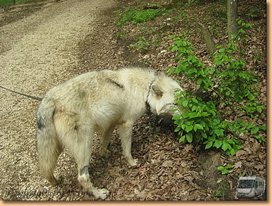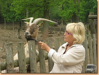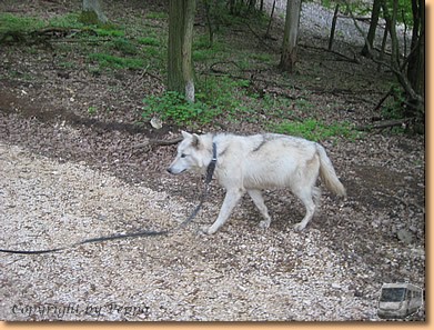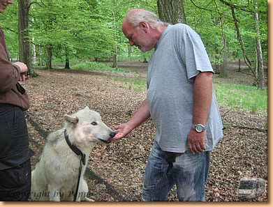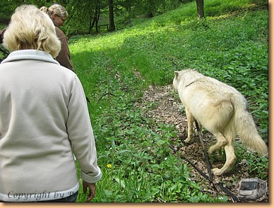 Kein Regen, die Sonne scheint und der Tag bringt uns ein unvergessliches Erlebnis. Nach einem gemeinsamen Mittagessen mit Anna und Peter beim Schurlwirt gehts auf nach Ernstbrunn. Endlich können wir unseren Gutschein einlösen und an einem Spaziergang mit einem Wolf samt Trainerin teilnehmen. Cherokee, ein grauweißer Wolf wird aus dem Gehege geholt, am Halsband mit langer Laufleine befestigt und auf geht es. Die erste Viertelstunde halten wir gehörigen Abstand, wir werden aber sowieso total ignoriert. Mit der Zeit wird der Abstand geringer und wir dürfen den Wolf auch füttern und kurz streicheln. Die Trainerin ist aber immer auf der Hut und reagiert sofort auf jede Bewegung des Tieres.