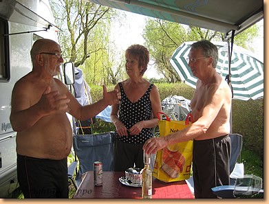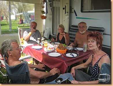 Wieder herrliches Wetter, zu Mittag die Einladung von Sigrid und Edi auf eine Brotzeit nehmen wir natürlich gerne an. Der Tisch biegt sich vor lauter Köstlichkeiten a' la Germany, aber auch der Wodka aus Polen von Elke und Klaus ist nicht zu verachten.