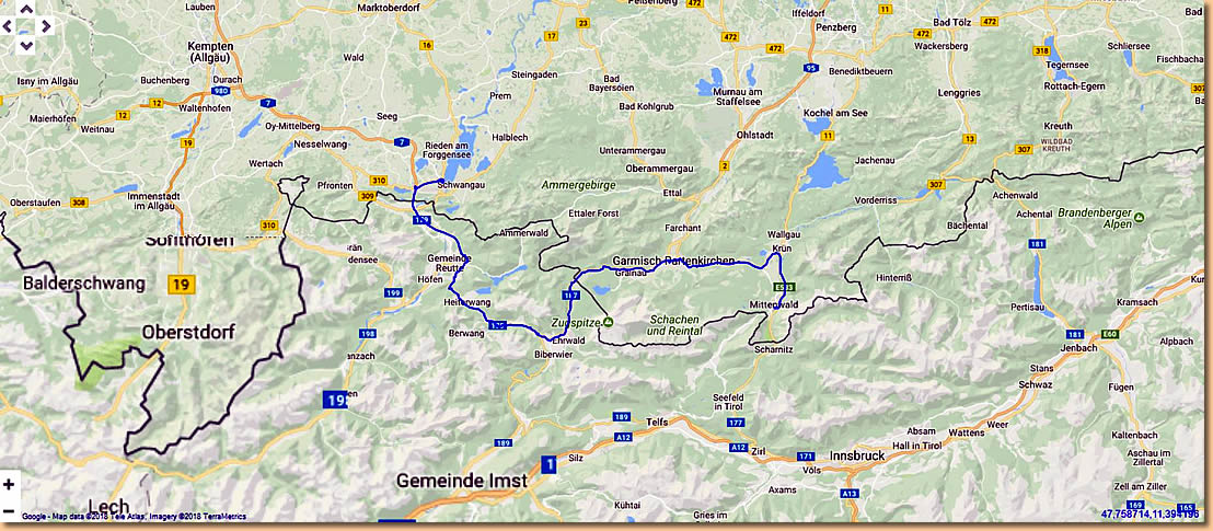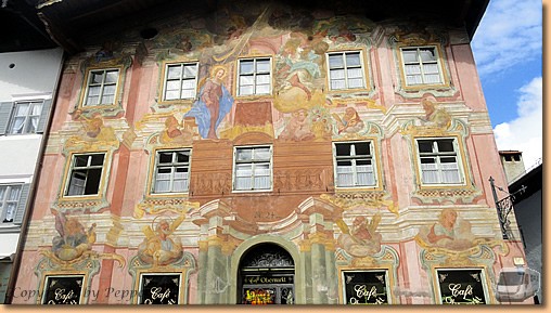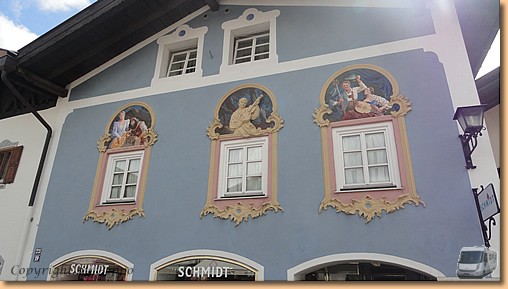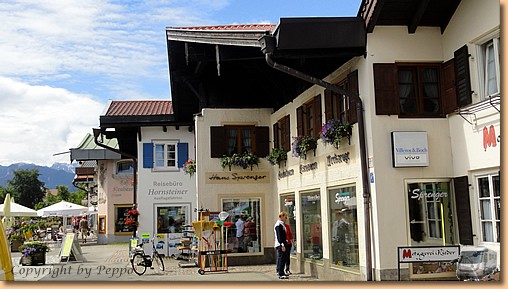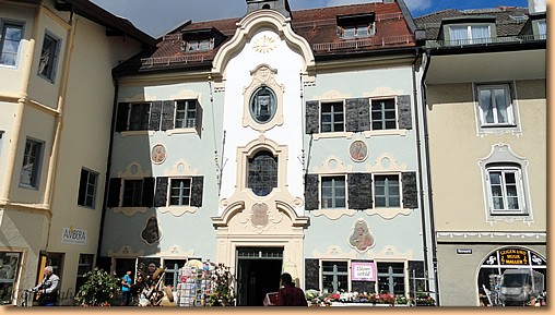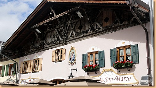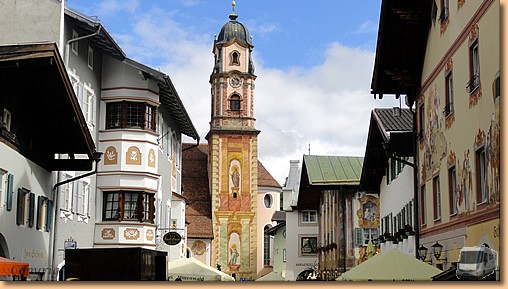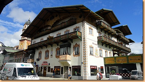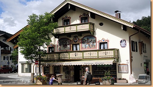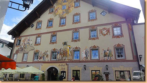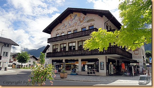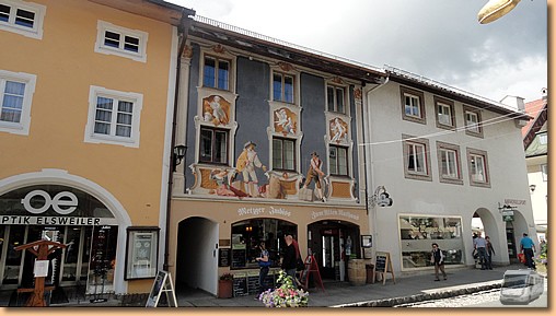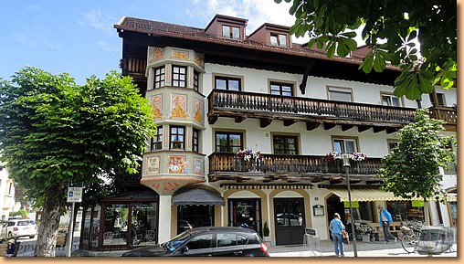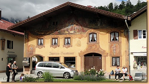 Füssen verlassen wir bei Nieselregen und in Mittenwald scheint die Sonne. Eine Stadt mit wunderschön bemalten Häusern (Lüftlmalerei), die Altstadt voll mit Geschäften, Cafes und Gaststätten. Mitbringsel für die Kinder werden gekauft und zu Mittag essen wir preisgünstig in einem schattigen Biergarten. |