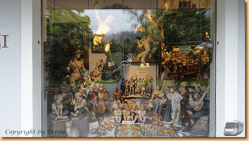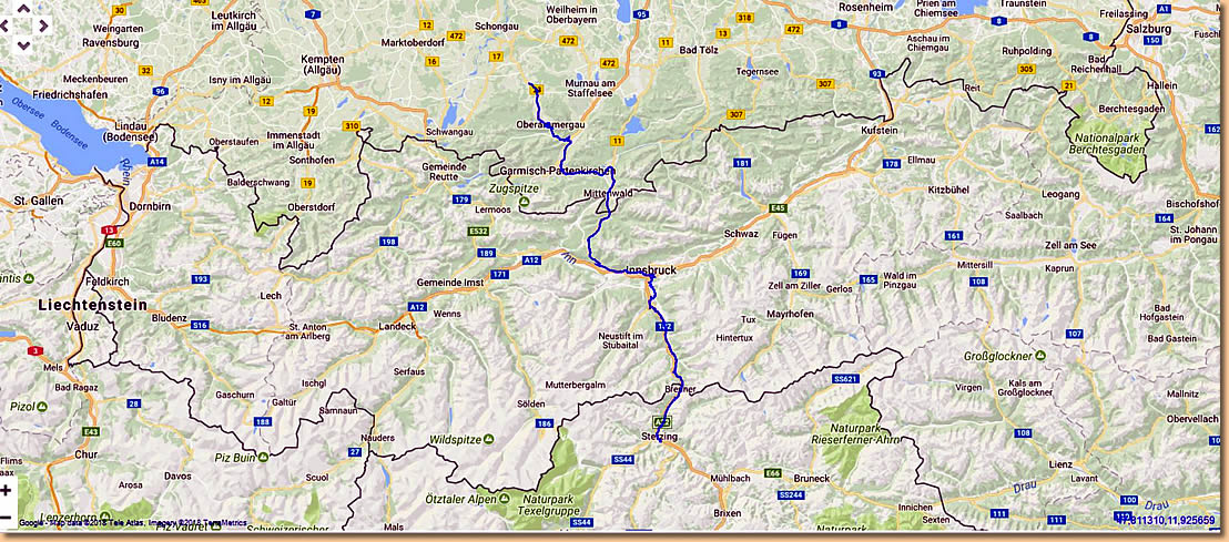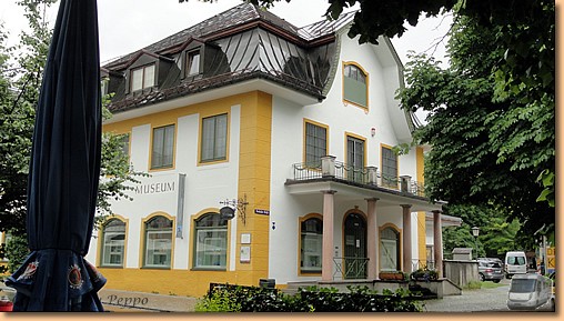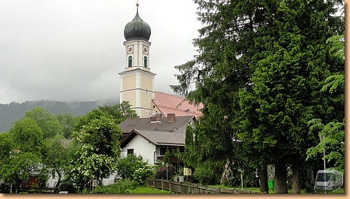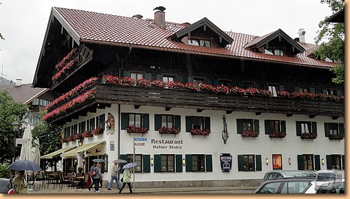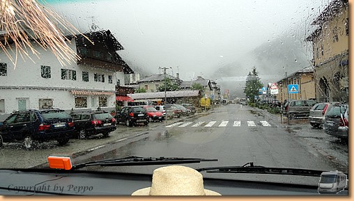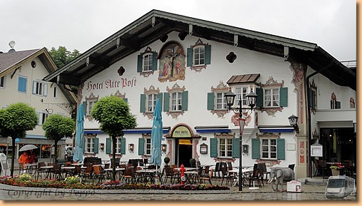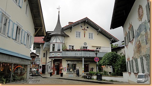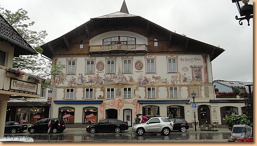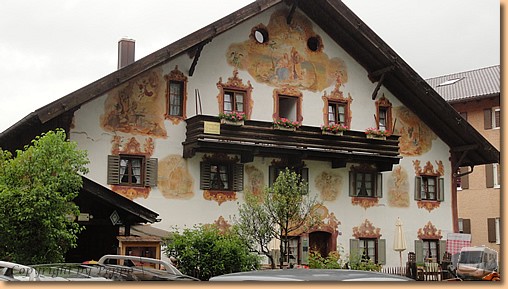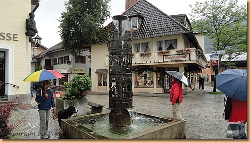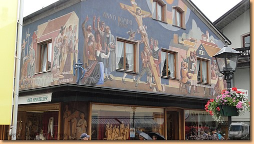 Garmisch-Partenkirchen fällt dem Regen zum Opfer, am Stellplatz in Oberammergau warten wir auf eine Regenpause. Tatsächlich hört es auf und wir marschieren Richtung Stadt. Nach fünf Minuten ist die Regenpause vorbei und wir ziemlich nass. Aber wir halten durch - Müsli hat noch am meisten Spass dabei - und machen unseren Rundgang durch den durch Lüftlmalereien, Holzschnitzerläden und Passionsspiele berühmten Ort.