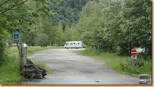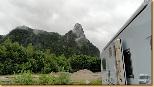Wieder beim Womo entschließen wir uns den nicht sehr einladenden Stellplatz zu verlassen. € 7.- für einen Schotterplatz ohne irgendetwas ist auch nicht schlecht. In Bad Bayersoien stehen wir zwar optisch auch nicht besser, aber wenigstens gibt es Strom und V/E. Da wir erst einmal beim Trockenlegen von Kleidung und Fell sind, verzichten wir auf eine weitere Sightseeingtour und bleiben im angenehm temperierten Wohnmobil.