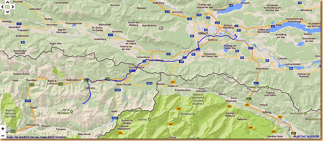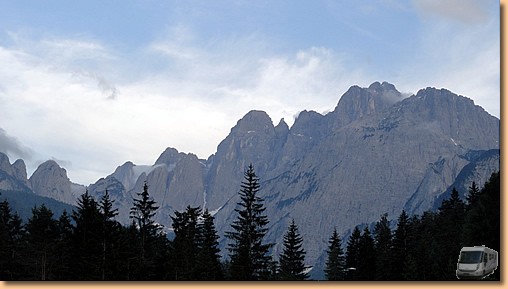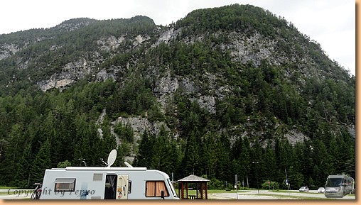 Weiter gehts nach Valbruna. Der Stellplatz im Saiseratal ist mitten im Wald, umgeben von hohen Felswänden der julischen Alpen. Ein italienisches Womo und wir, eine ruhige Nacht ist garantiert.