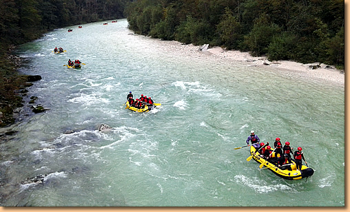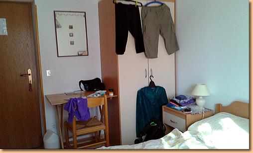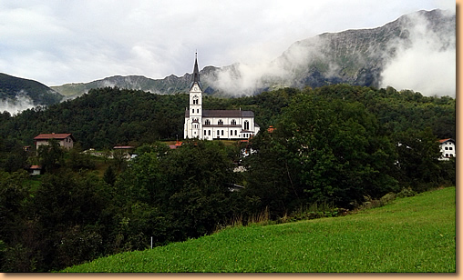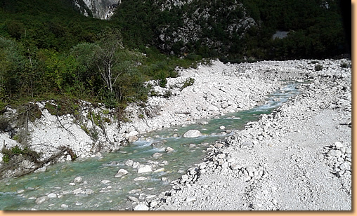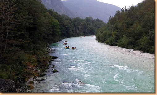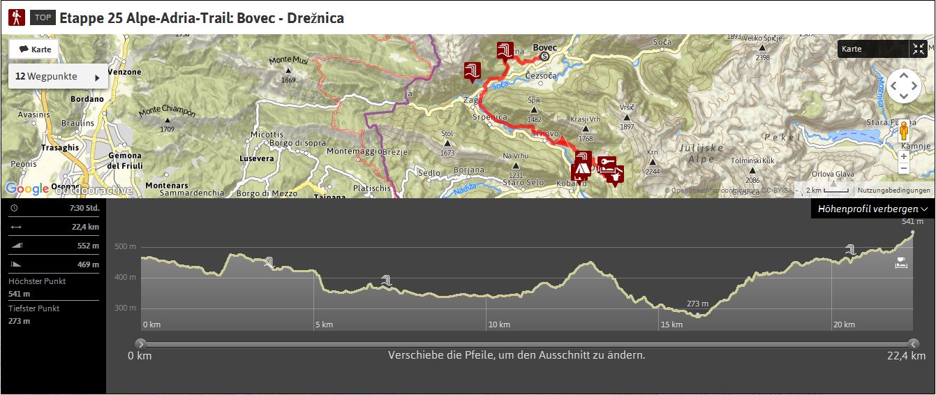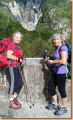 Sonnenschein!!! Nachdem wir außerhalb von Bovec nächtigen und nicht mehr in den Ort zurückgehen wollen, nehmen wir für die erste Stunde eine andere Route und treffen nach ca. 4 km wieder auf den AAT. Halt an der Boka-Brücke für ein Foto mit dem imposanten Wasserfall. Kaffeepause in Zaga, der Weg weiter zum Kamp Trnovo führt entlang der Soča, teilweise durch Wald und über eine Weide. Jausenpause im Kamp. Kaum sind wir wieder unterwegs heißt es Regenschutz drüberziehen. Langsam werden wir Profis darin. Wir fühlen uns mit den Raftingbooten verbunden, Wassersportler und Weitwanderer haben zur genüge Wasser von oben und unten. Auf mehr oder weniger guten Wegen kommen wir nach ca. 8 Stunden Gehzeit in Dreznica an. Alle App. mit Zeltlern voll, die vor den Regenmassen am CP flüchten. Wir bekommen noch ein Zimmer in der Pension HRAM, HP €42.-. Abendessen und Frühstück gut, Zimmer weniger, da die Sauberkeit zu wünschen übrig lässt. WLAN gibt’s, Bilder werden geschickt und um 21:30 ist Nachtruhe. |