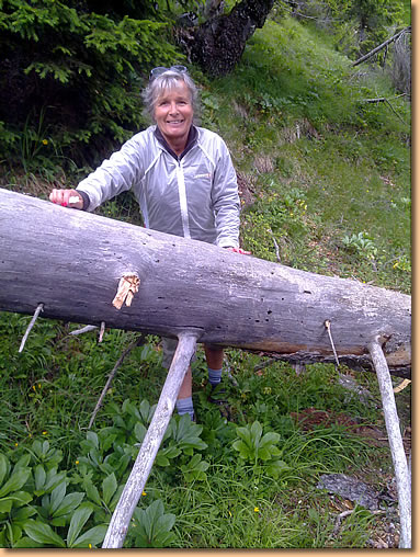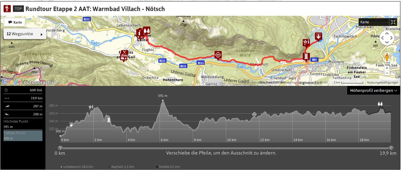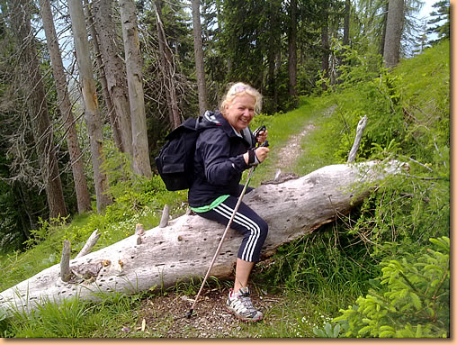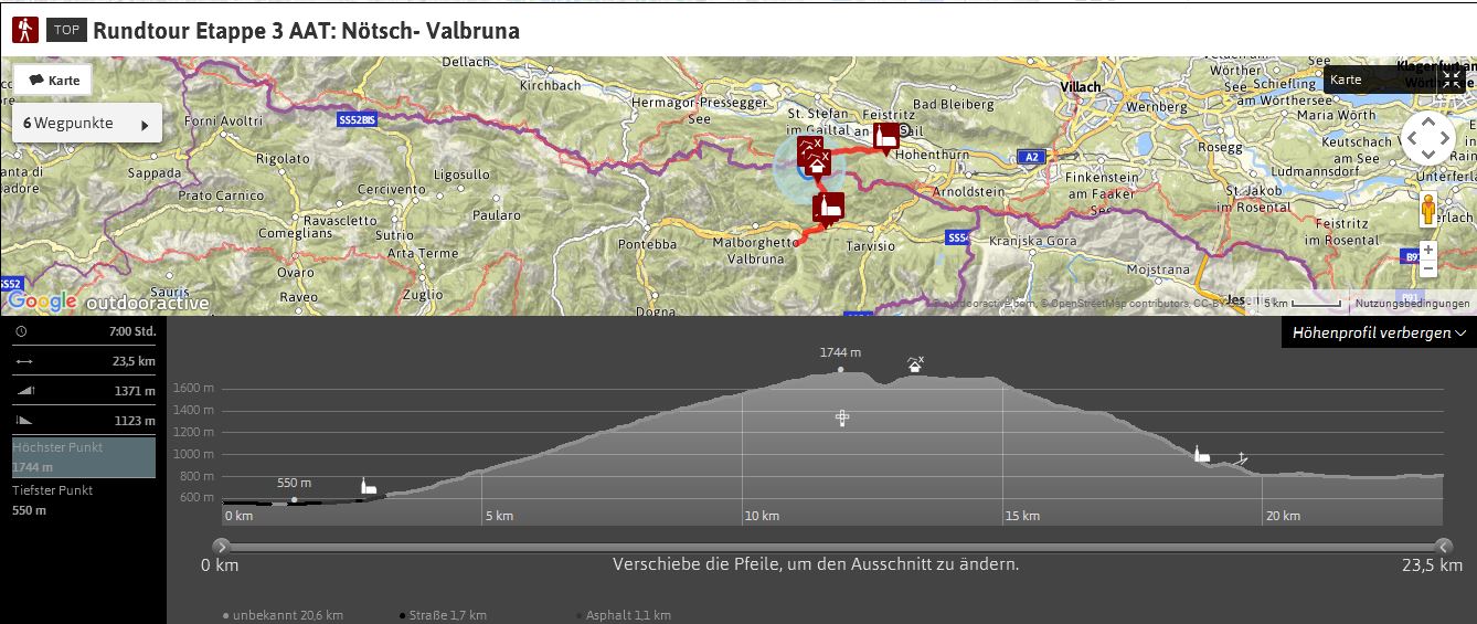 Taxi Seppi liefert uns in Feistritz ab und auf Schusters Rappen geht es für uns weiter. Die Sonne versteckt sich und bald gibt es auch die ersten Regentropfen. Wir nehmen ab der Pfarrkirche nicht den Güterweg, sondern wandern durch den Wald entlang des Feistritzbaches. Auf der Achomitzeralm machen wir Rast. Es ist ziemlich kalt und ungemütlich, die Pause fällt daher nur kurz aus. Auf der italienischen Seite werden wir auf einer Weide von Kühen mit ihren Kälbern empfangen. Der Weg wird zunehmend nass und matschig und die Muttertiere rundherum tragen diesmal wenig zum „fröhlichen Wandern“ bei. Kaum fühlen wir uns wieder sicherer treffen wir auf den ziemlich steilen Schotterweg bergab nach Camporosso. Vom Regen ziemlich rutschig kommt uns die Strecke endlos vor. Am Etappenziel schaut alles wieder rosig bzw. orange aus. Eine Bar findet sich und Espresso sowie Aperol-Spritz schmecken herrlich und natürlich steht Haustaxi Seppi auch bald vor der Türe. |