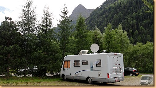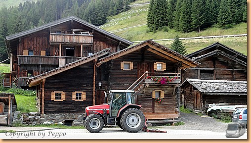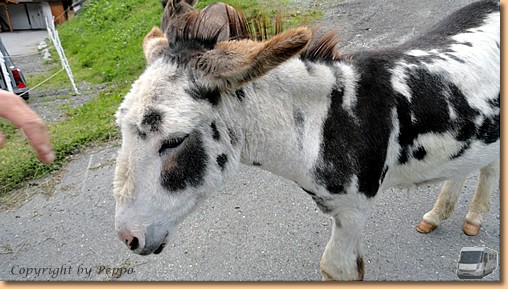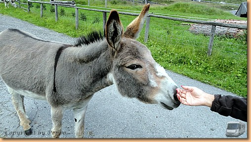 Wir sind wieder unterwegs! Es geht Richtung Rosenheim um hier bei einem Frankia-Händler nähere Details über ein neues Womo einzuholen. Die erste Station ist der uns schon bekannte Parkplatz beim Tauernhaus in der Gemeinde Matrei in Osttirol. Das Thermometer zeigt gleich einmal um 12°C weniger, die Sonne samt ~29°C lassen wir im Tal. Einem Spaziergang steht daher nichts mehr im Weg. Leider sind die Alpakas nicht mehr auf der Weide, daher begrüßen uns Esel, Pferde, Kühe und Ziegen. |