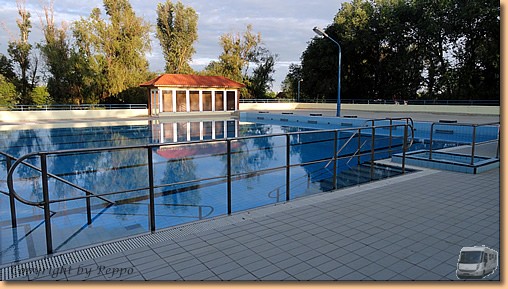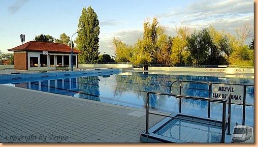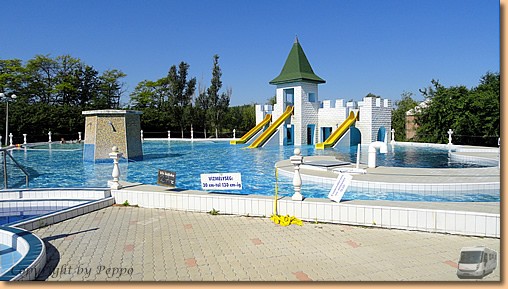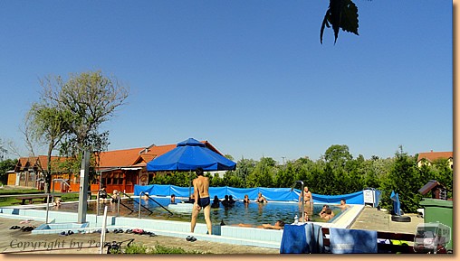 Turkeve und sein Thermalpetroleumwasser hat uns wieder. Bei wolkenlosem Himmel treffen wir um 9 Uhr am Campingplatz ein. Wir zählen 9 Camper und natürlich sind auch wieder liebe Bekannte dabei. Wir suchen im "Fahrerlager" einen Platz und fühlen uns gleich wieder wohl. Wiese frisch gemäht, alles sauber und gepflegt. Sanitäre, Küche usw. haben sich nicht verändert. Im Thermenbereich ist das große Becken mit den Rutschen, das Heilwasserbecken und das große Schwimmbecken in Betrieb. Natürlich sind wir in kurzer Zeit im Petroleumwasser und . . . . wir "stinken" wieder und unsere Silberringe haben sich schon wieder verfärbt.