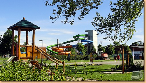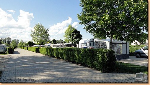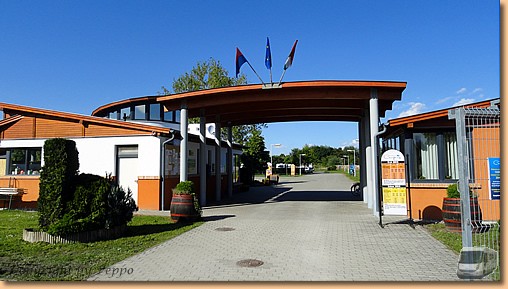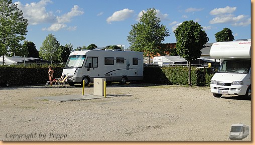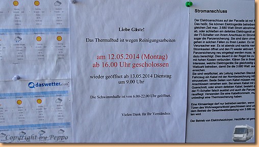 Wir stehen am Stellplatz vor der Therme mit Strom und Wasser. Wir dürfen die sauberen und äußerst gepflegten Sanitäreinrichtungen benutzen. Der Campingplatz ebenfalls sauber und perfekt, alle stehen in Reih und Glied. Dies und die vielen Verbote etc. zur Platzbenutzung schrecken uns etwas ab. Etwas zuviel Bevormundung für unseren Geschmack, denn wir glauben wir wissen selber was wir zu tun oder zu lassen haben. |