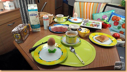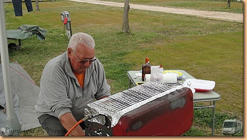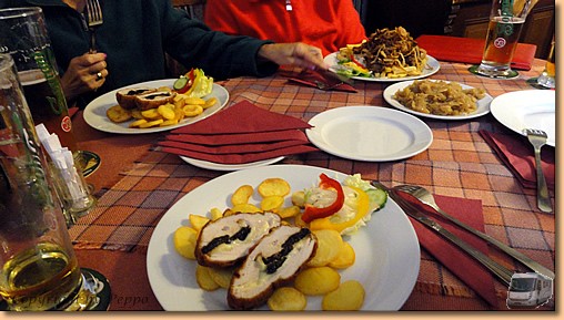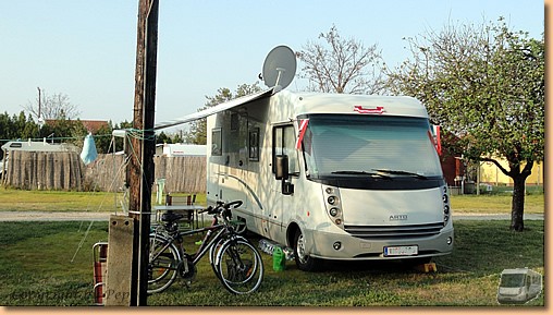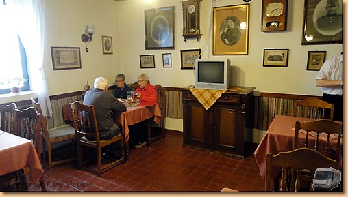 Wir ernennen den heutigen Sonntag zum Schlemmertag. Das Wetter ist nicht berauschend, also verzichten Helga und Müsli nach ihrem Morgenspaziergang auf weitere größere Aktivitäten. Nach einem ausgiebigen Frühstück wechseln wir zu Toni und Yvonne ins Vorzelt um bei Kaffee und Likör zu relaxen. Ich mache brav eine Baderunde um dann zum Mittagessen fit für "das Fassl" zu sein. Ein uriges Lokal mit Fassbier und hervorragender ungarischer Kost. |