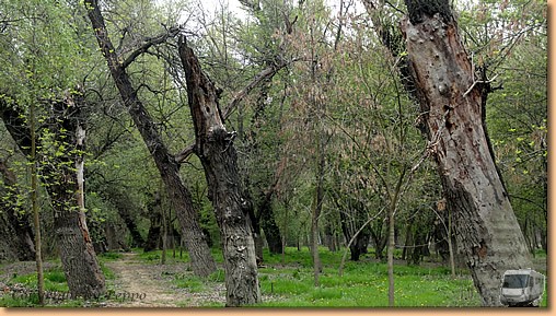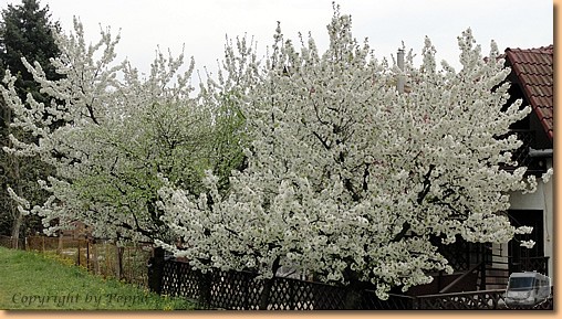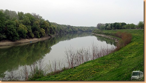 Nach dem Vormittagsbad fahren Helga und Klaus mit dem Rad in die Stadt um beim Bäcker, Gemüsehändler und Spar Einkäufe zu tätigen. Am Nachmittag spazieren wir zur Theiss. Müsli findet einen ungarischen Freund, die beiden Vierbeiner können nach Herzenslust spielen. Unser Weg führt uns vorbei an blühenden Obstbäumen zum Überschwemmungsgebiet der Theiss. Im Moment führt sie Niedrigwasser, im vergangenen Jahr stand das Wasser allerdings bis zum oberen Damm. Die Bäume zeigen heute noch den Hochwasserstand an. Am Abend sind wir Drei recht müde und sagen bald "Gute Nacht" bis morgen. |