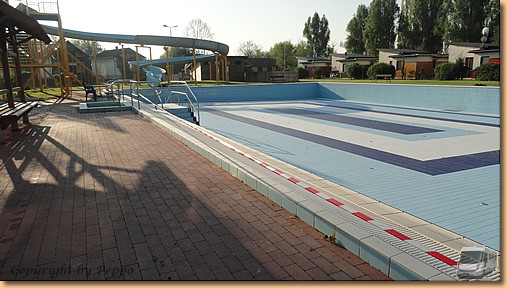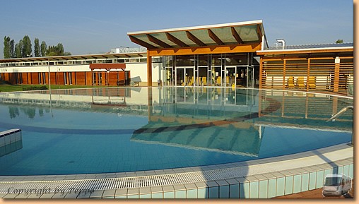 Gegen Mittag ist Baden angesagt. Zwei Heilwasserbecken im Freien, Schwimmhalle und Wellnessbecken sind mit normalem Wasser befüllt. Bei Schlechtwetter gibt es allerdings keine Möglichkeit im warmen Thermalwasser von oben her im Trockenen zu bleiben, da keines von beiden eine Überdachung hat. Wir eröffnen unsere heurige Grillsaison und Toni steuert seine köstlichen gegrillten und flambierten Bananen bei.