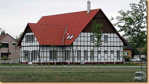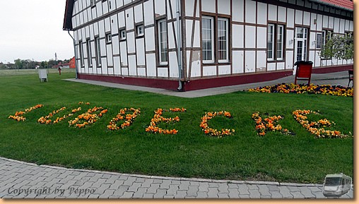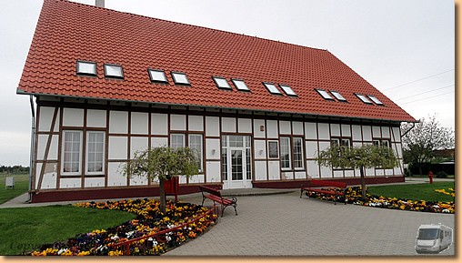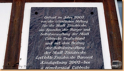 Kurz nach Mitternacht beginnt es zu stürmen und der Wind bleibt uns den ganzen Tag erhalten. Am Morgen kämpfen wir uns tapfer entlang der Theiss bis zu einem 2002 mit finanzieller Hilfe der Stadt Lübbecke errichteten Fachwerkhaus. |