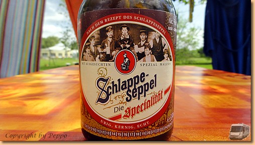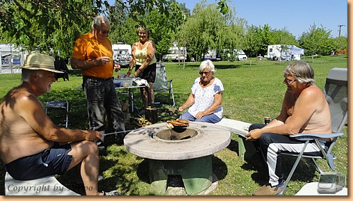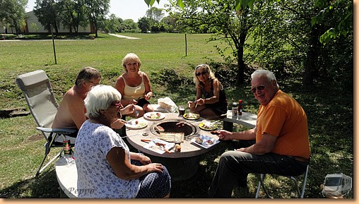 Herrlicher Sonnenschein, ideal um den Camping-Grillplatz in Beschlag zu nehmen. Bald bruzzeln über der Holzkohle Würste in verschiedensten Variationen; Salate, Saucen, Weißbrot und flüssige Zutaten fehlen natürlich nicht. |