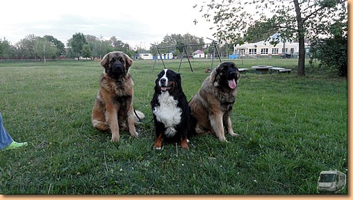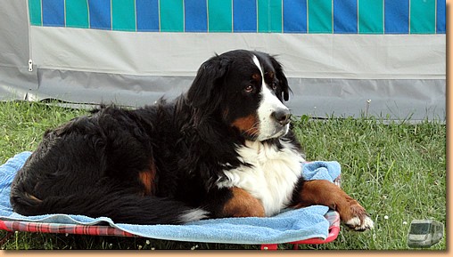 Wir überlassen das Bad den anderen Gästen und machen Womoschicht in der Sonne. Unserem kleinen Schurli wünschen wir alles Gute zum 1. Geburtstag! Möge er seinen beiden Dosenöffnern Claudia und Florian weiterhin klarmachen wer der Chef im Haus ist. Müsli hat zwei neue Camperfreunde aus Polen und fühlt sich beim Spielen mit den stattlichen Leonbergern ganz in ihrem Element. |