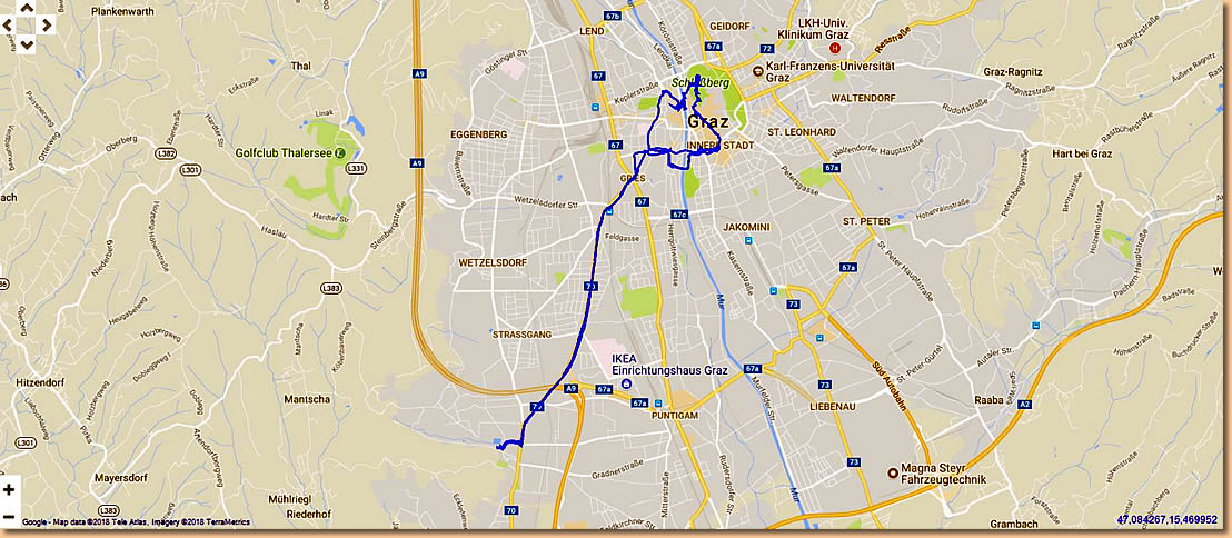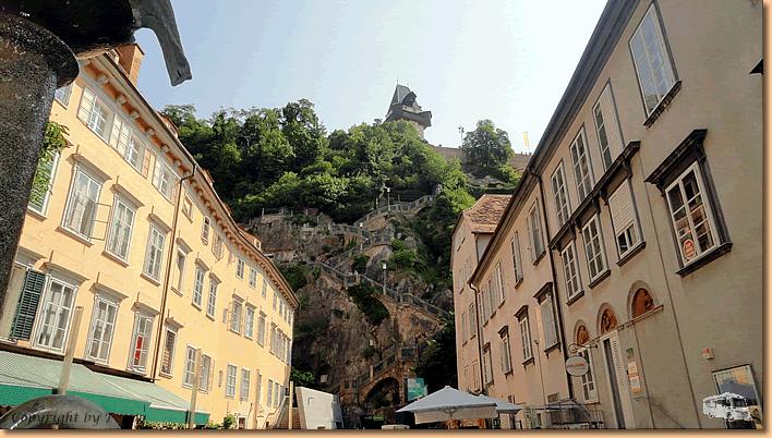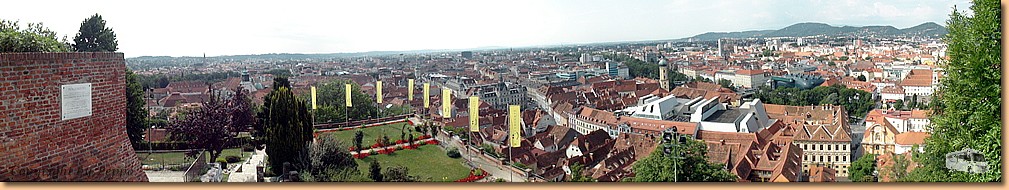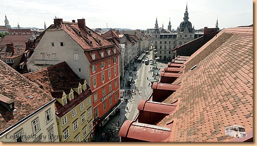 Anschließend bewältige ich den Aufstieg mit dem Lift zu einem ausgedehnten Rundgang am Schloßberg, gönne mir eine Rast im Biergarten und der Abstieg erfolgt mit der Schloßbergbahn. Hier erlebt man einen nahezu 360° Rundblick über Graz.