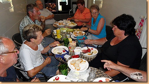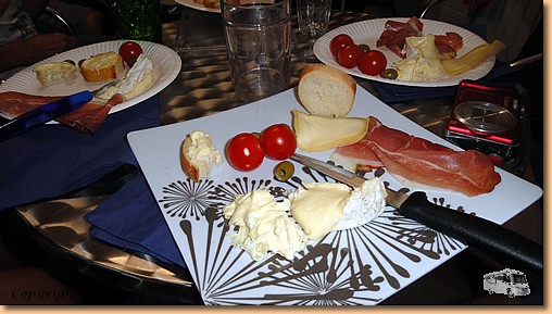 Am Nachmittag kommt die ersehnte Abkühlung mit etwas Regen, aber da sind wir schon im Wohnmobil. In einer Regenpause treffen wir uns noch im Freien, die geplante Käseverkostung (franz. Käse von Christi und Karl) muss jedoch am Abend ins "Kaffeehaus" verlegt werden.