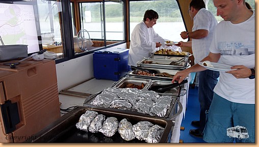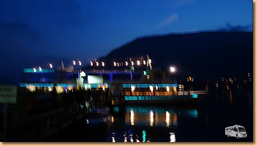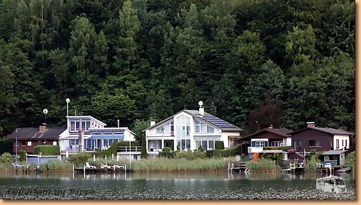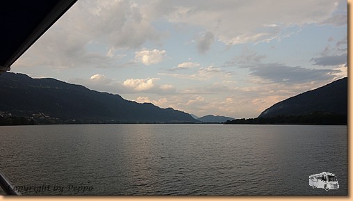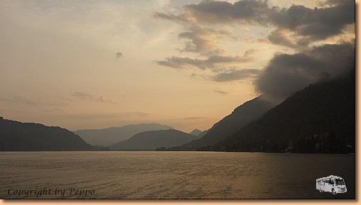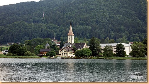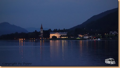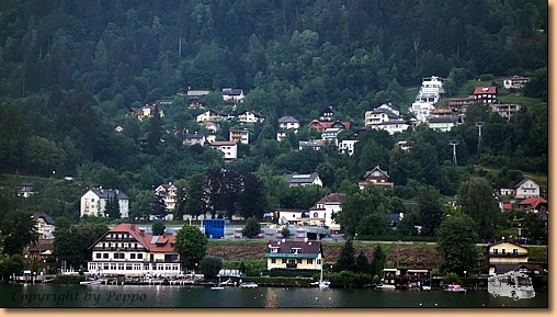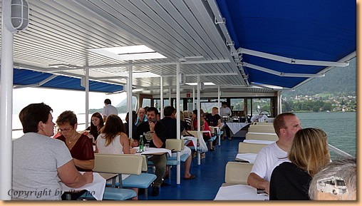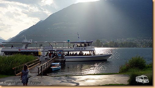 Heute geht es vorerst mit dem Auto nach Ossiach. Hier wartet die MS Ossiach auf uns. Mit der Kärnten-Card ist die Passage gratis, wir zahlen nur den Aufpreis für "Schiff & Grill - Romantische Abendfahrt an Bord". Leider ist kurz vor dem Ablegen ein schweres Gewitter über die Region gezogen, es hat abgekühlt und es regnet zeitweise. Trotzdem können wir auf dem "Sonnendeck" Platz nehmen. |