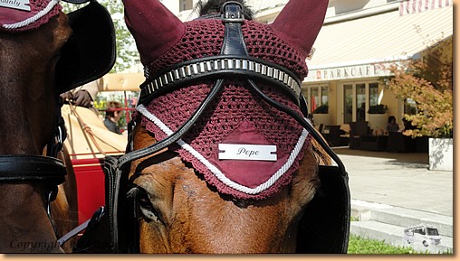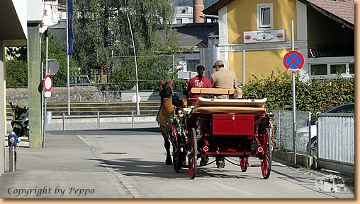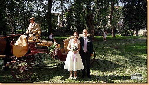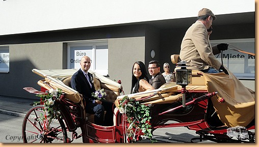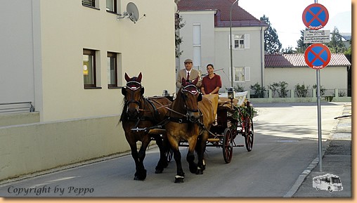 Bei strahlendem Sonnenschein bringt eine wunderschöne, von zwei strammen Pferden gezogene Hochzeitskutsche den Bräutigam und die Trauzeugen Eva und Sigi von uns weg nach Landskron.