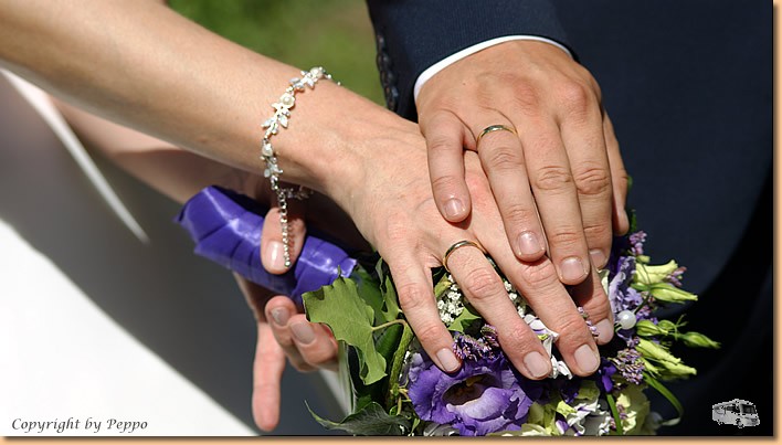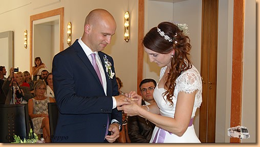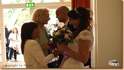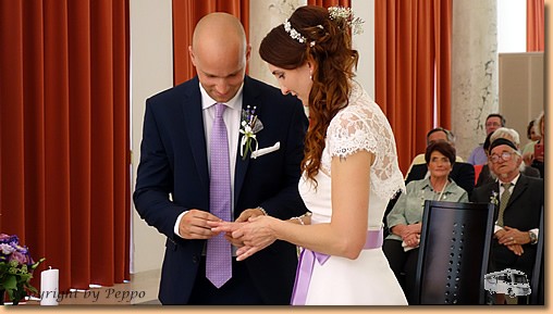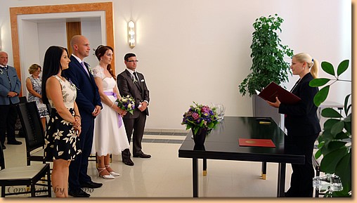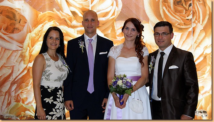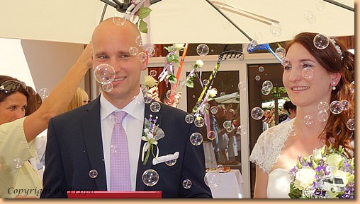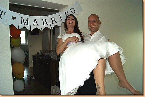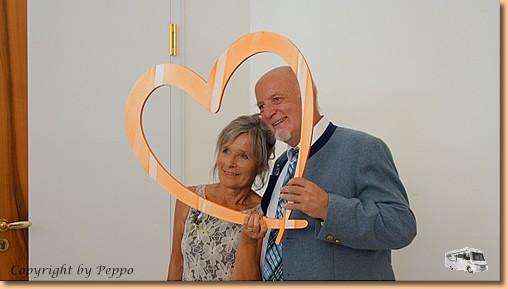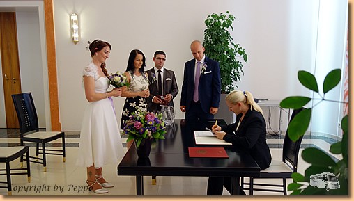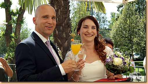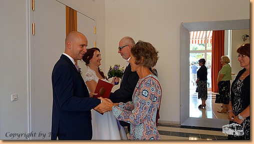 Die Standesbeamtin trifft ein, Formalitäten werden erledigt und dann endlich ist es soweit: Wir hören zweimal ein lautes "JA" und unser Florian ist nun Ehemann und Claudia seine rechtmäßig angetraute Frau und unsere Schwiegertochter bzw. Schwägerin.