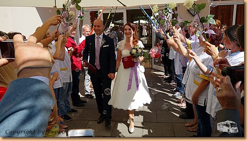 Zwei Autos werden mit Geschenke vollgepackt - die Eheleute bedanken sich für den wunderschönen Tag und verschwinden in ihrer in der Zwischenzeit dekorierten Wohnung.